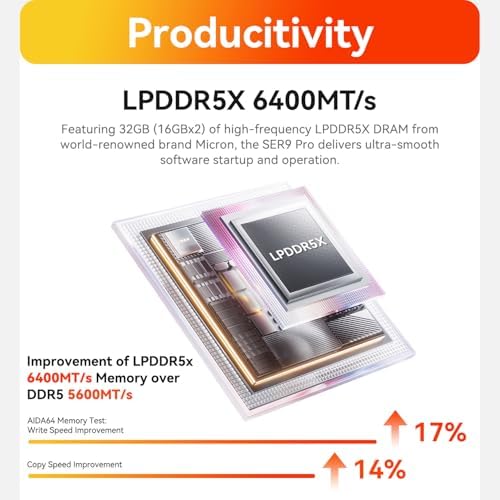 The SER9 Pro features an impressive 32GB (8GBx4) of high-frequency LPDDR5X DRAM, providing an ultra-smooth startup and operation for all your software needs. With a built-in 1TB M.2 2280 NVMe PCIe 4.0×4 SSD and dual SSD slots supporting up to 8TB of total storage, you’ll benefit from ultra-fast data transfers and ample capacity for even the most demanding tasks.